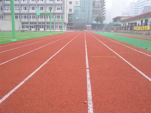 EPDM透氣型塑膠跑道, 首先需對水泥基礎(chǔ)進行防水處理或瀝青基礎(chǔ)進行封底處理。待基礎(chǔ)層處理完畢保養(yǎng)24小時后即可攤鋪跑道底層,用3-4mm的高彈性橡膠黑色再生膠粒加入相對比例的聚氨酯粘接膠水,攪拌均勻倒入場地,刮耙刮平,鋪設(shè)厚度8mm,固化保養(yǎng)24小時。用2-3mm的EPDM跑道面層材料加聚氨酯粘接劑攪拌均勻后倒入施工場地,刮耙刮平,用鐵板或者機械壓實,平整度達到國家標(biāo)準(zhǔn),特殊花紋設(shè)計、耐磨防滑,一體成型面層,厚度均勻,不掉顆粒,不鼓泡,耐老化,色彩鮮艷,在水泥基礎(chǔ)上鋪裝最佳