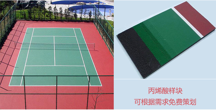 工容易,價(jià)格適中,維修及維護(hù)方便。 適用范圍: 適用于室內(nèi)外丙烯酸籃球場、 丙烯酸網(wǎng)球場、 丙烯酸排球場、 丙烯酸羽毛球場等, 還可做成彩色地坪,美化環(huán)境。